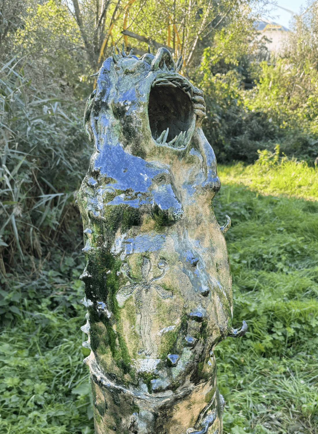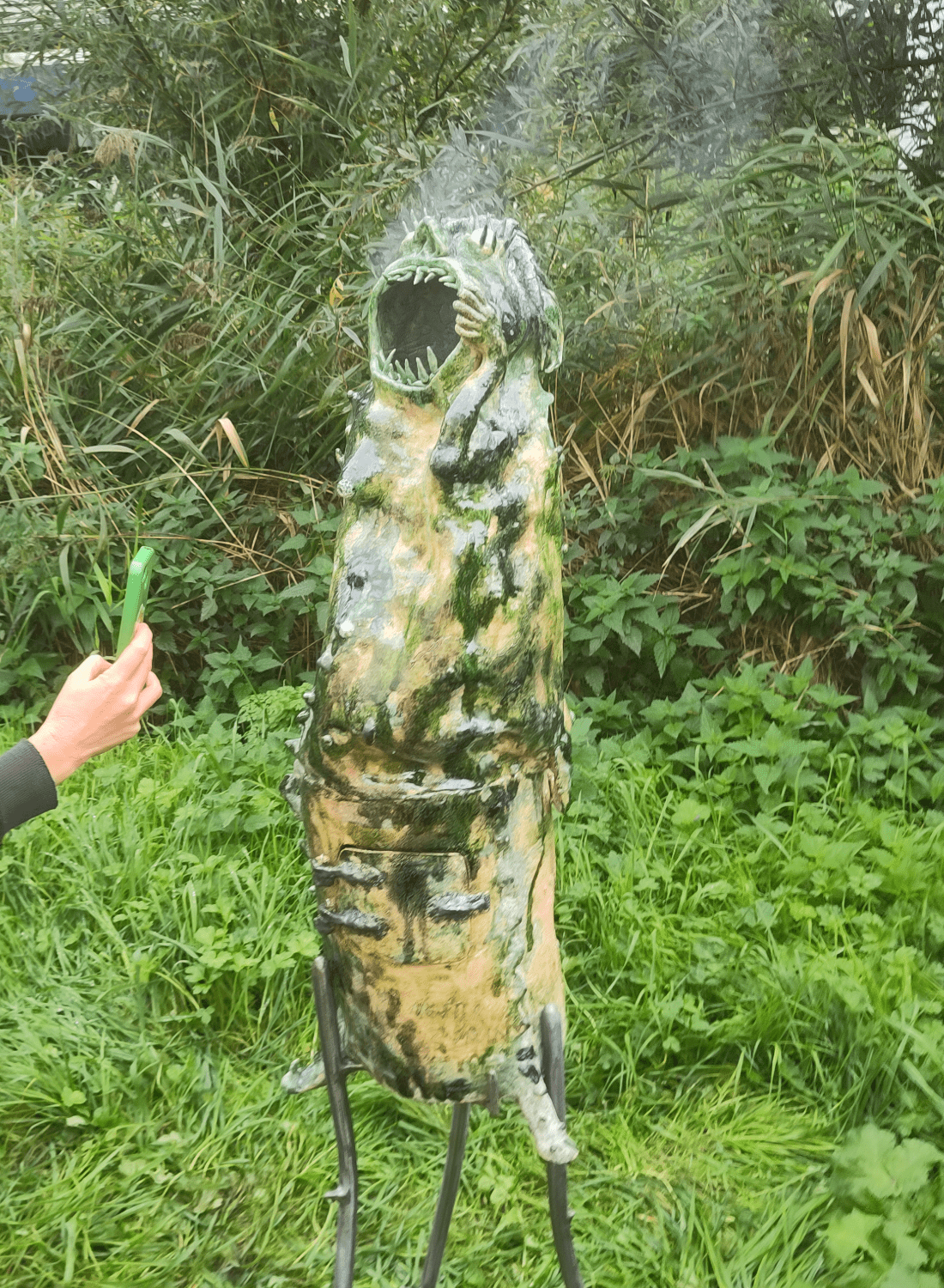 We all gathered in a simple tent perched above a circle of strawbales. Guarding our gathering, was a ceramic herbal oven in the shape of a screaming amphibian deity. Inside this ceramic sculpture, people could burn scribbled papers with wishes, memories, and departures in a simple ritual called Grief Spell. Via a little side-hatch, charcoal and myrrh resin was placed in the base of the pot, setting the writings ablaze.